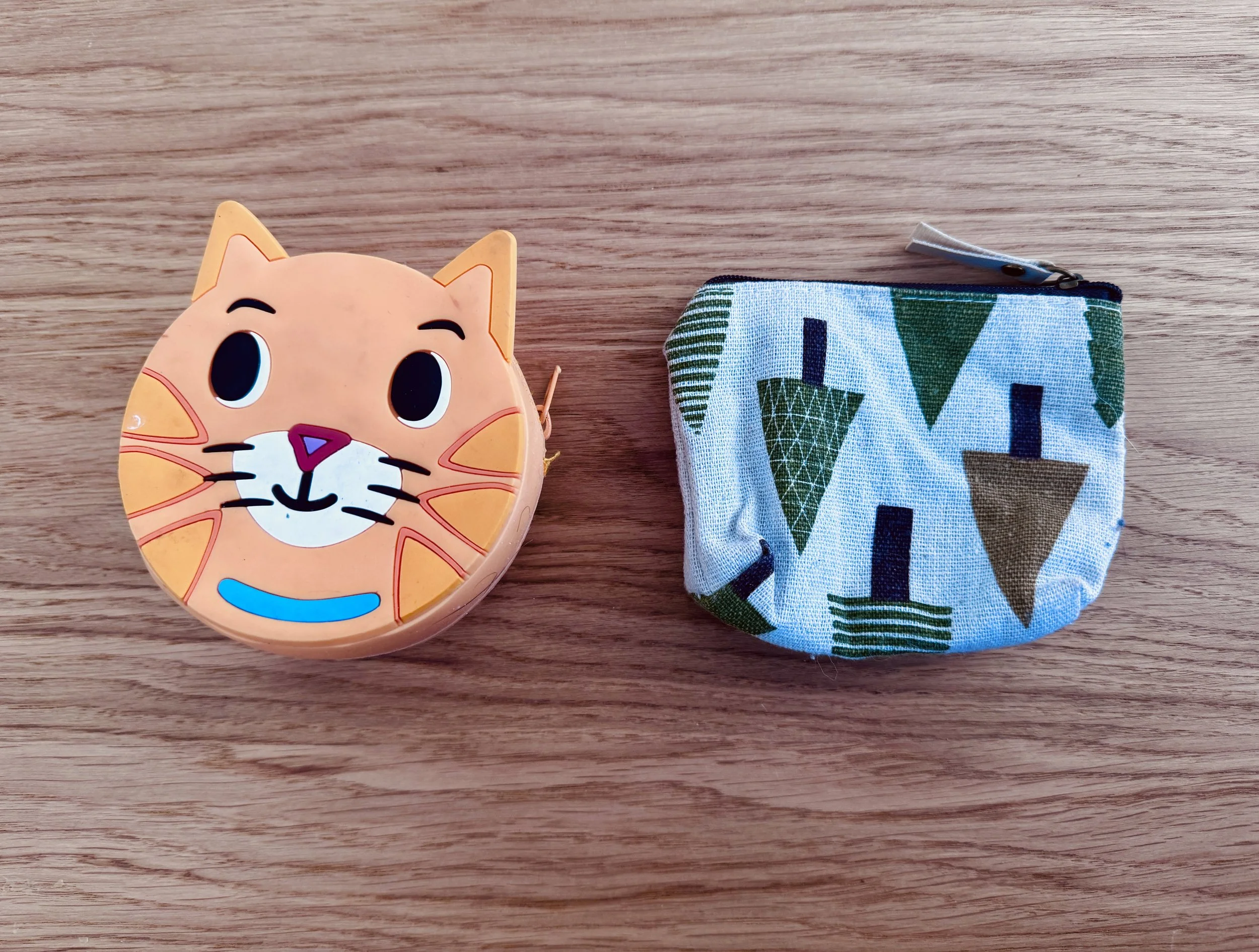 two small pouches, one that is cat shaped and bright yellow, and the other with images of trees on a white background