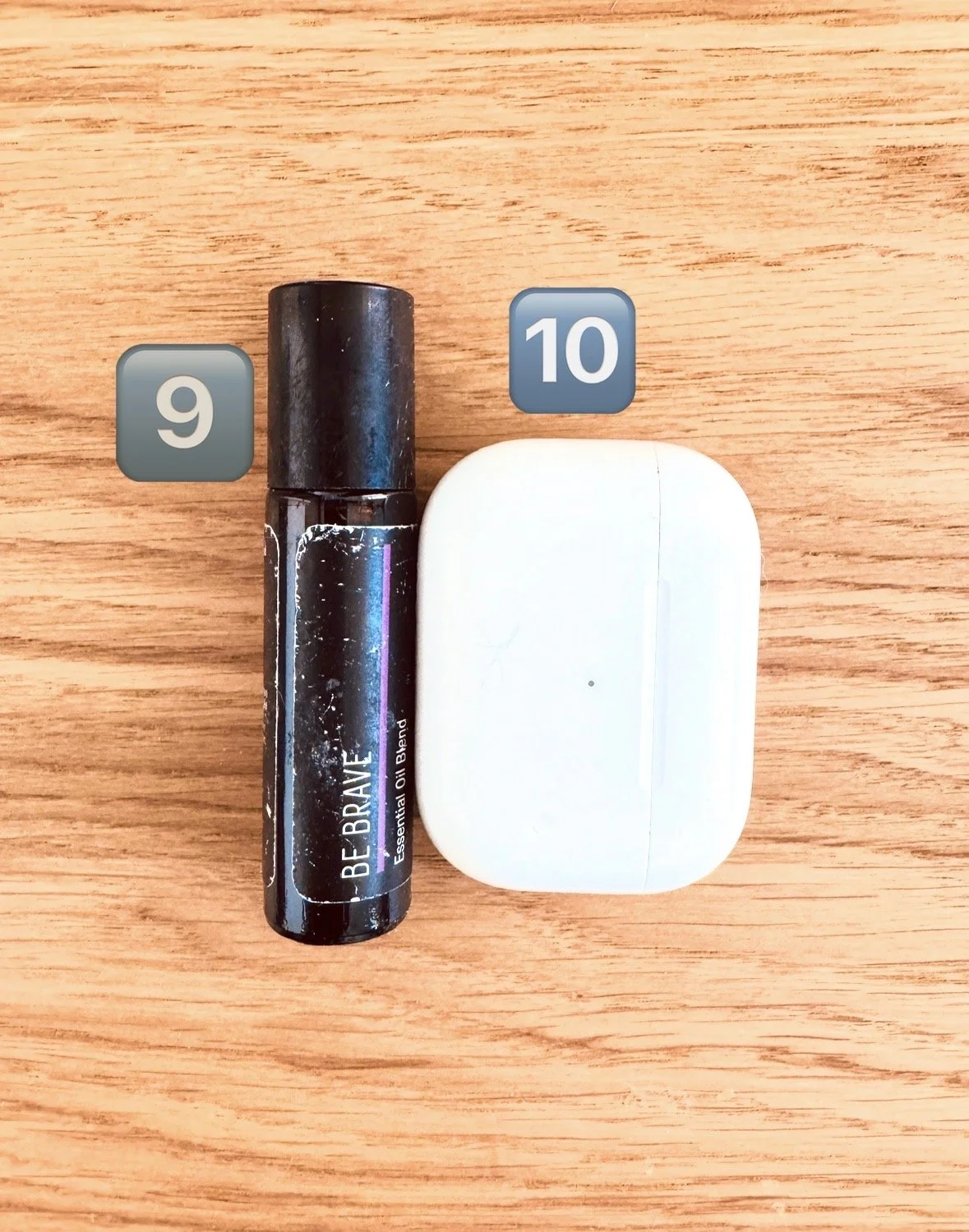 9. Essential oil roller. A regular bottle works well too, but I like the roller because there’s less risk of a spill, and it’s easy to apply to your skin. You could also apply a few drops of an essential oil to a paper towel or a cleaning cloth for glasses and put that in the pouch to hold the scent. Smell, sight, touch.